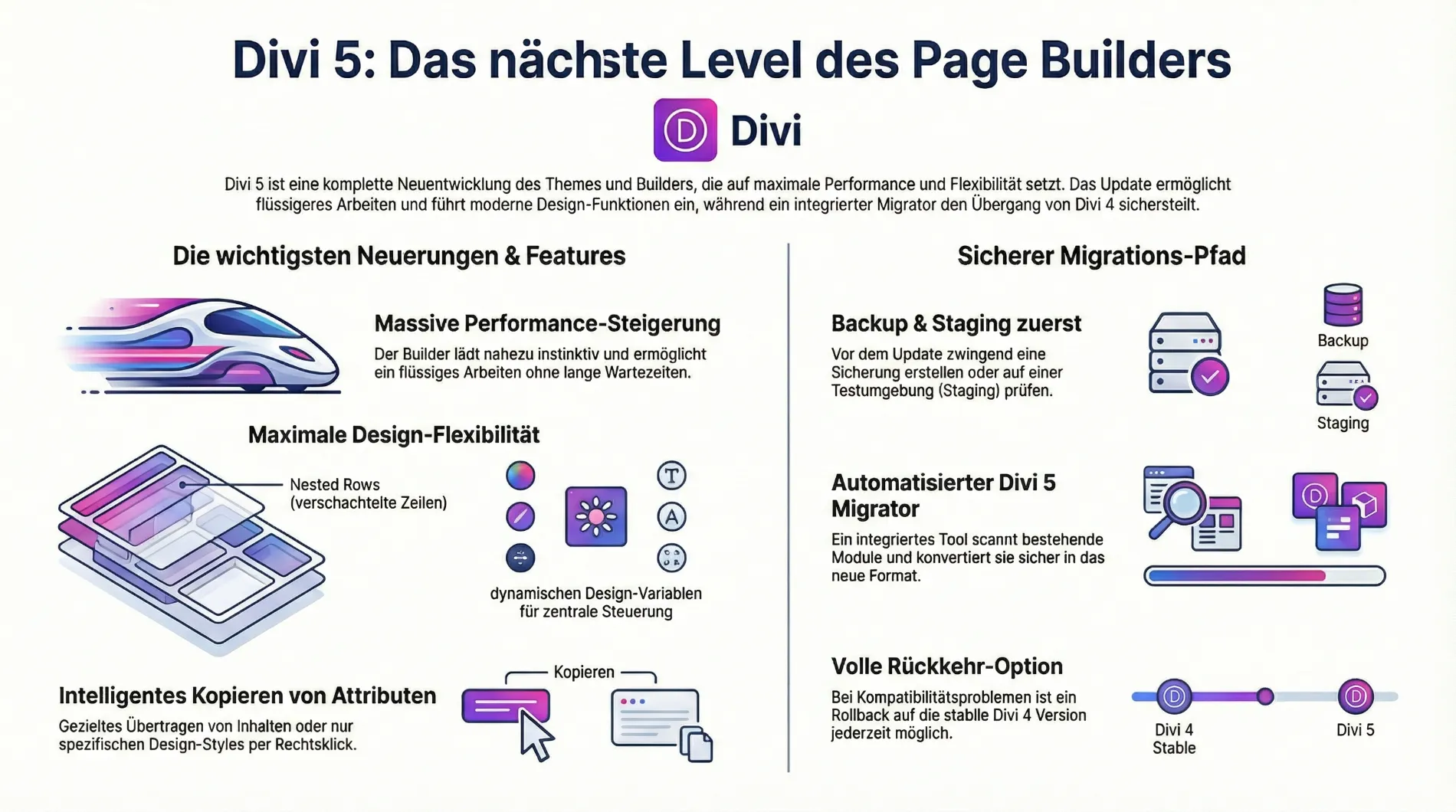 Willkommen zu unserem umfassenden Leitfaden, wie Du Deine Divi 4 Website sicher auf die brandneue Divi 5 Version aktualisierst und dabei die genialen neuen Funktionen von Divi 5 optimal nutzt. Divi 5 wurde von Grund auf neu entwickelt und bietet deshalb extreme Verbesserungen.
