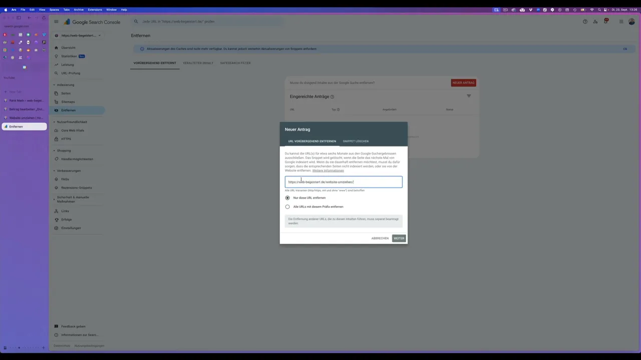 4. Füge die kopierte URL ein und entscheide: Nur diese URL entfernen oder Alle URLs mit diesem Präfix entfernen.